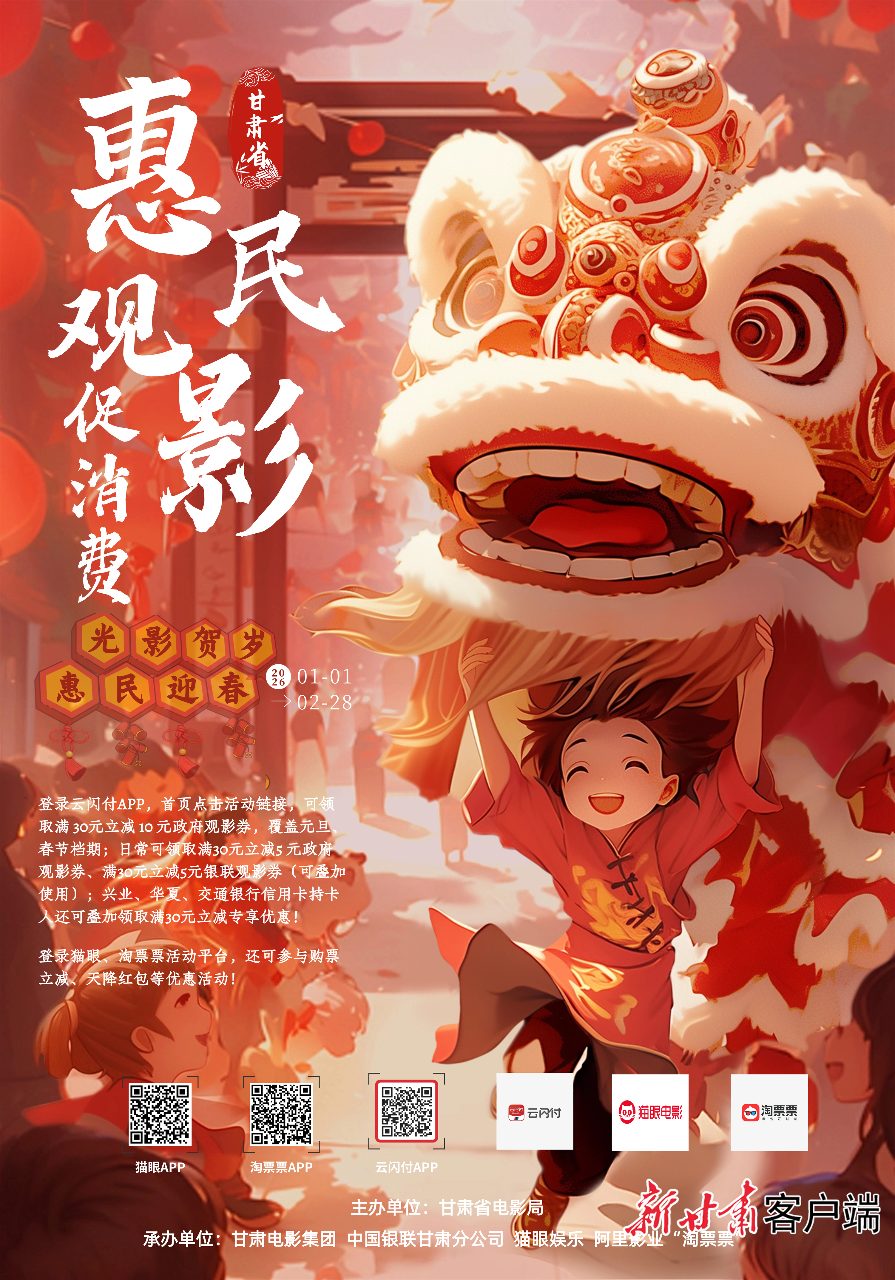 岁末迎新,光影传情。为切实满足广大群众节日观影需求,进一步激活电影消费市场,1月1日,2026年甘肃省惠民观影促消费“元旦档”活动将正式启动。